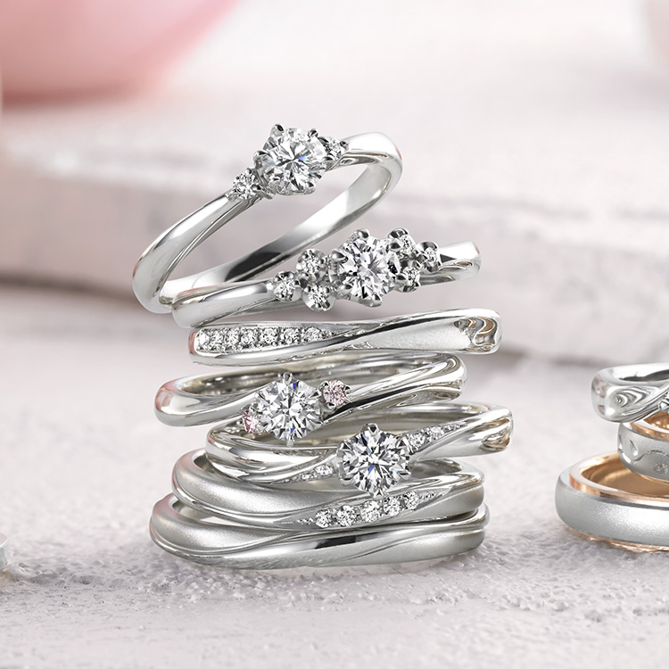 ウェーブラインが手元を美しく、たおやかに見せてくれる婚約指輪。